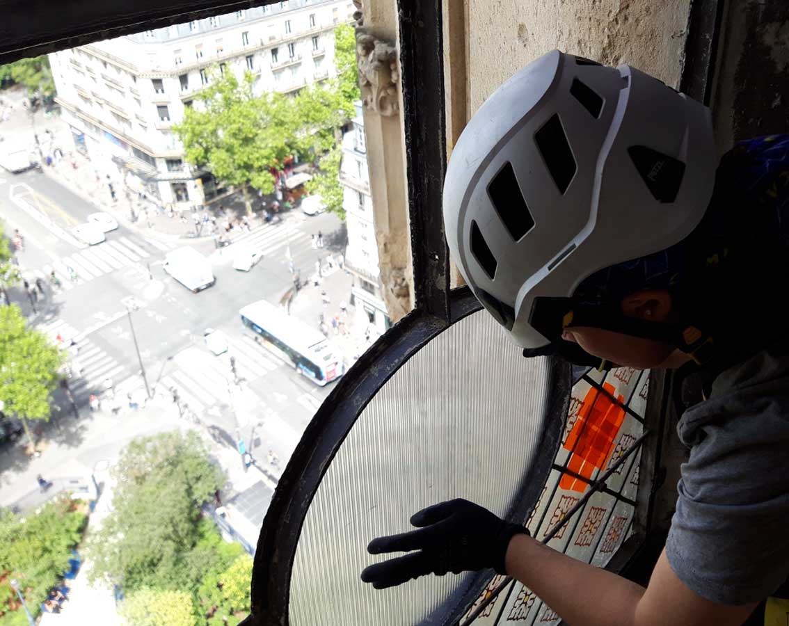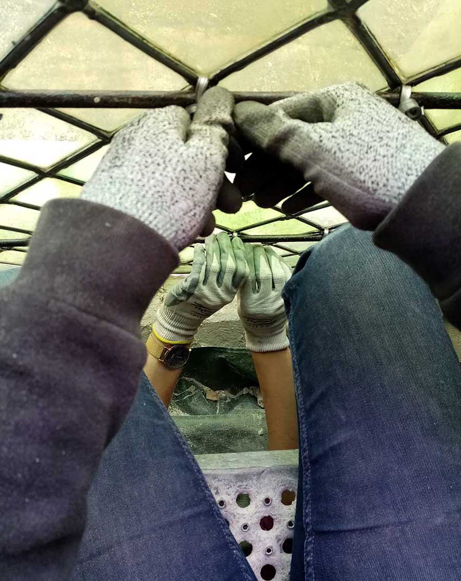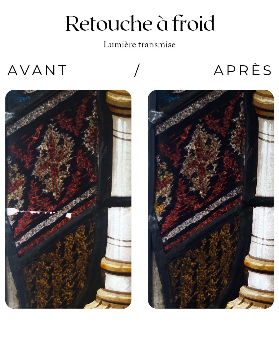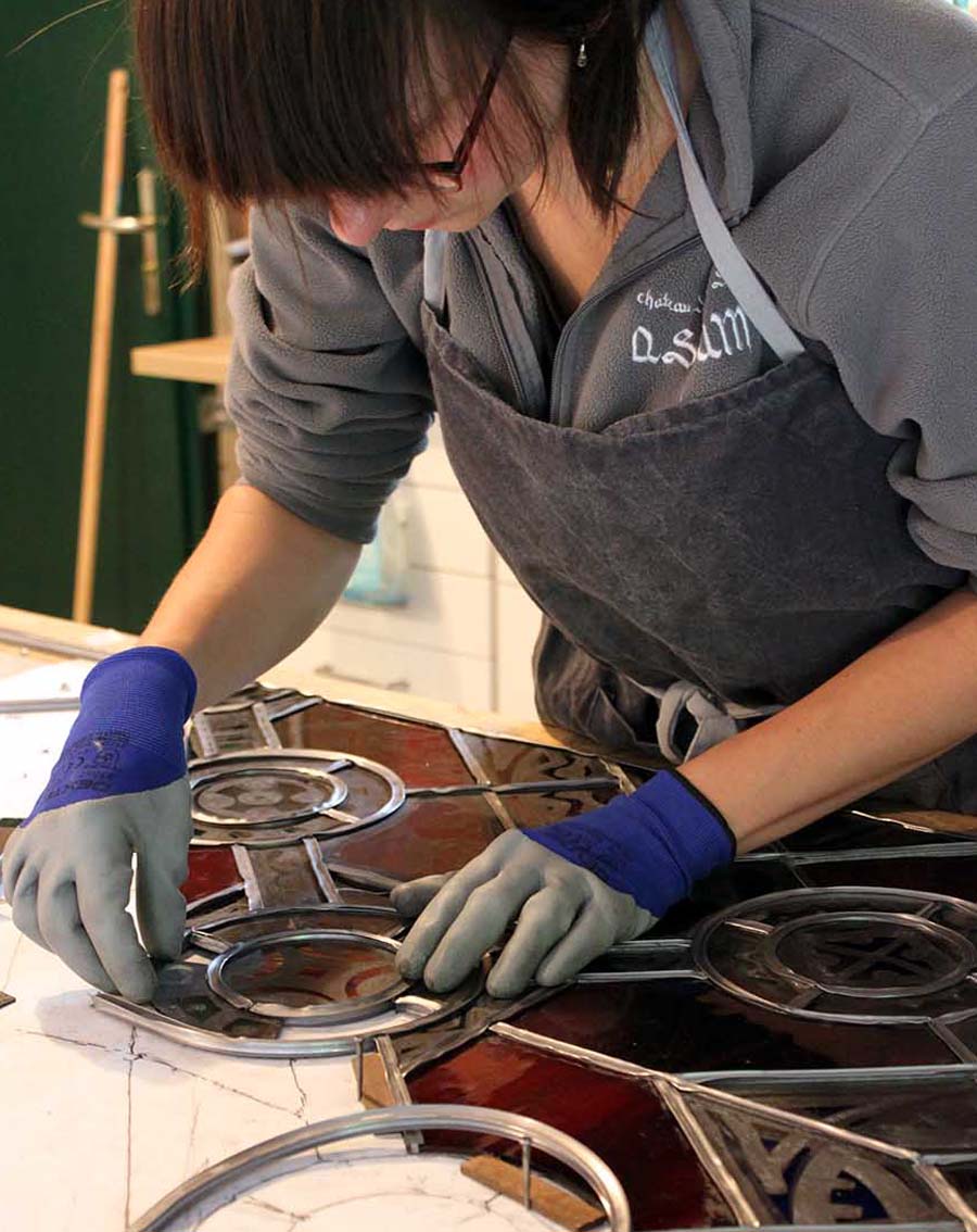 Connaissance approfondie : expertise des matériaux constitutifs : verres, plomb, grisaille, émaux, jaune d’argent, mastic et armatures métalliques anciennes.
