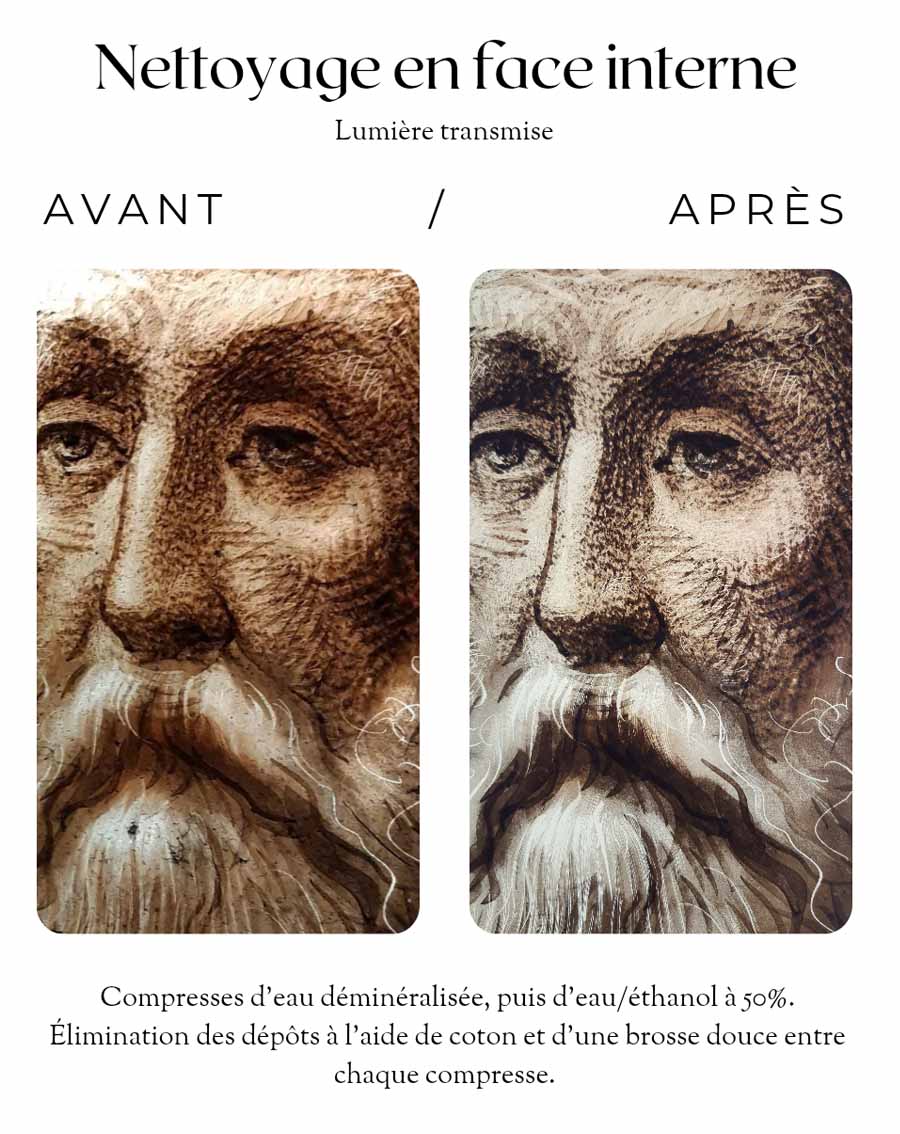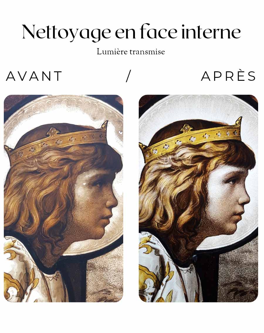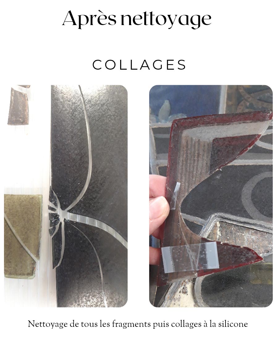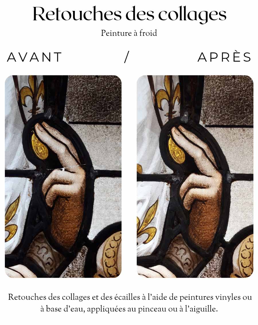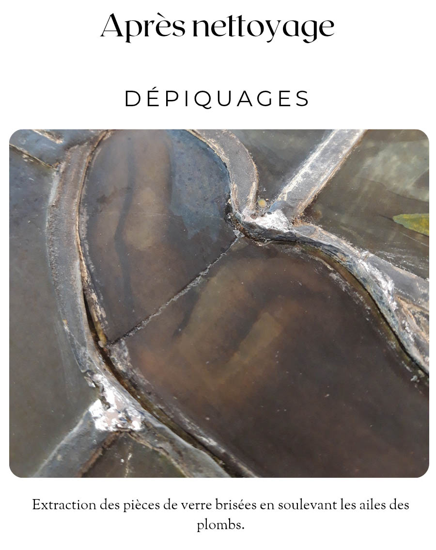 Nettoyage, collages et comblements, peinture, remise en plomb totale ou partielle.